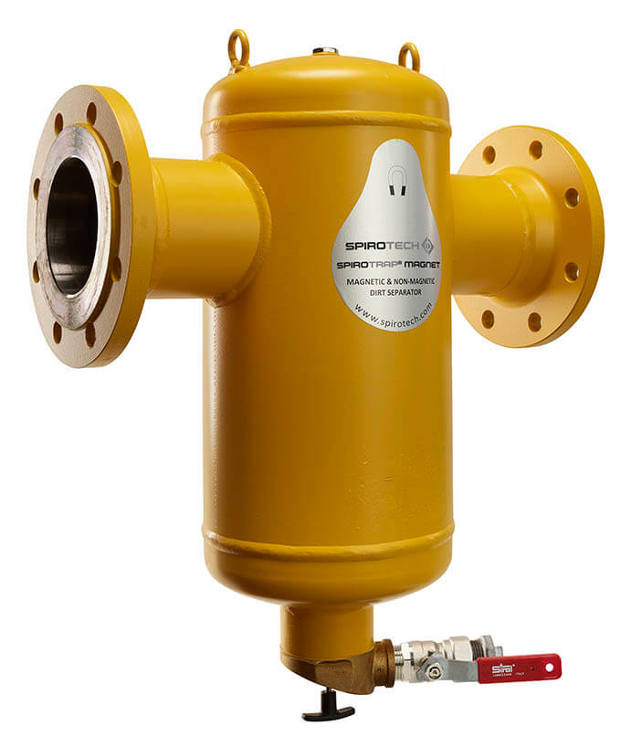 Deze stalen vuilafscheider zorgt voor een efficiënte afscheiding en verwijdering van het zwevende en circulerend vuil dat bijvoorbeeld tijdens de montage is achtergebleven. Hierdoor zijn obstructies en verstoppingen niet aan de orde, waardoor het installatiewater optimaal kan doorstromen. Een speciale magneet vangt ook het ijzerhoudend vuil (magnetiet) af, dat enorm schadelijk kan zijn voor onder andere transportpompen, warmtepompen en koelmachines.”